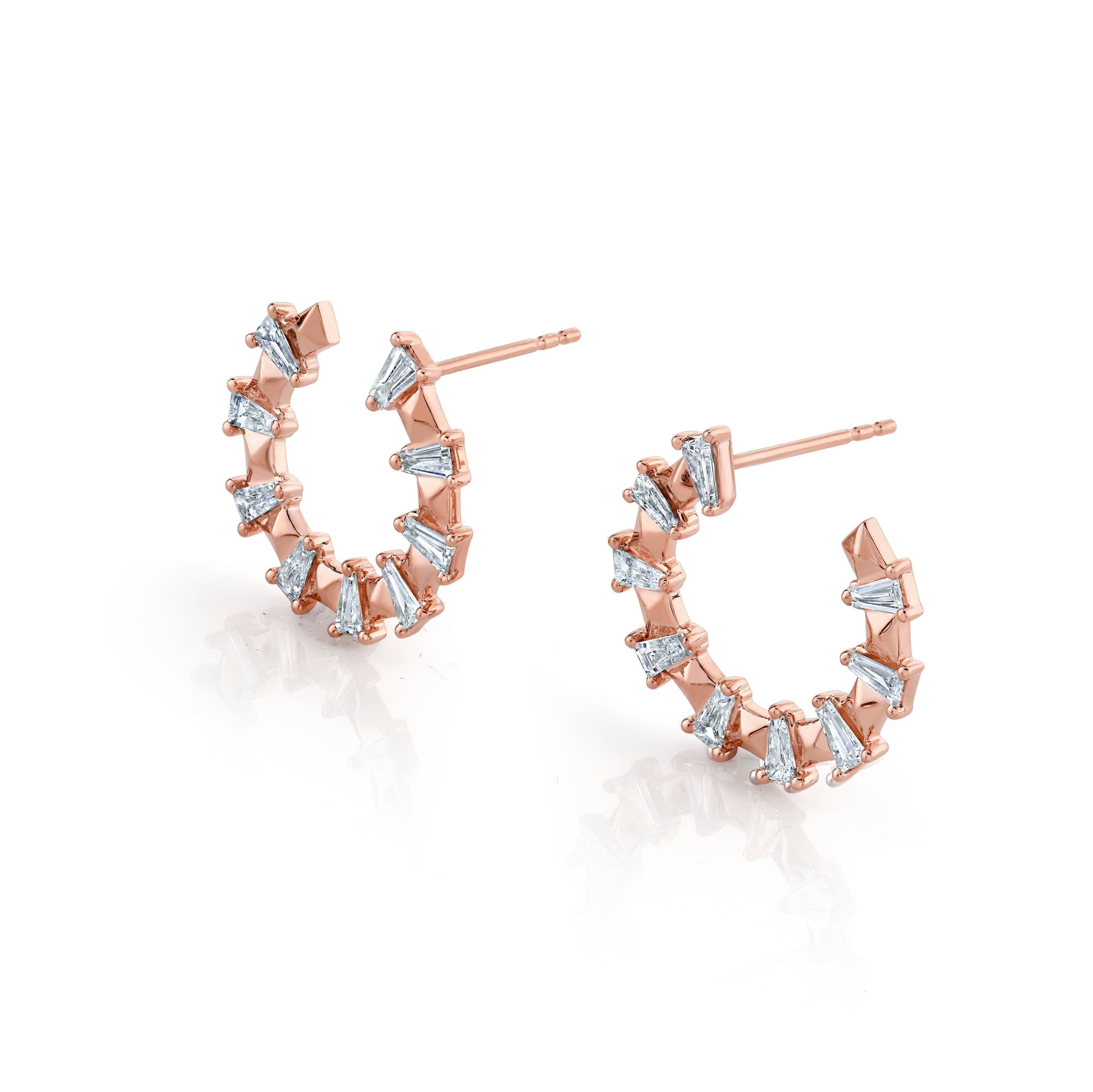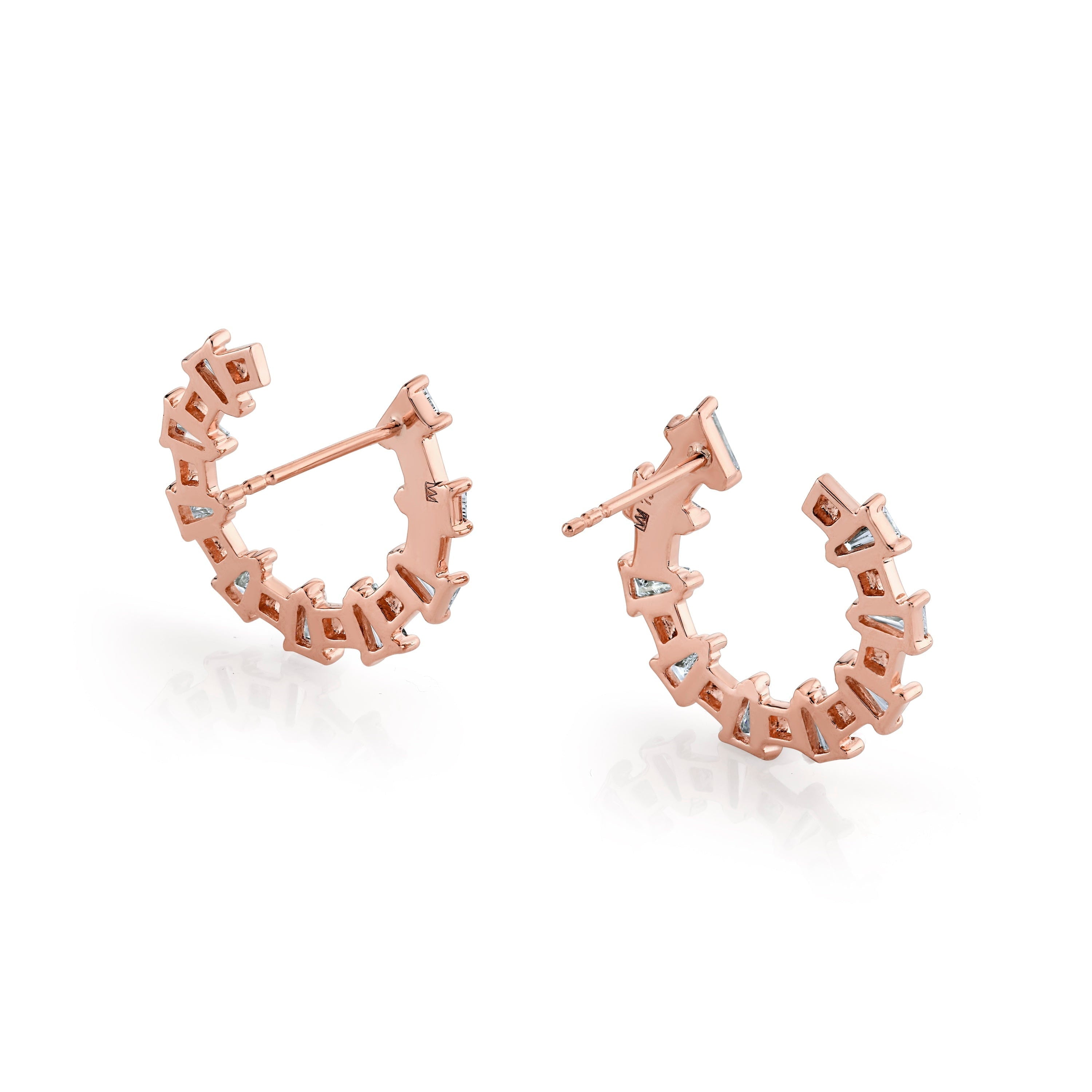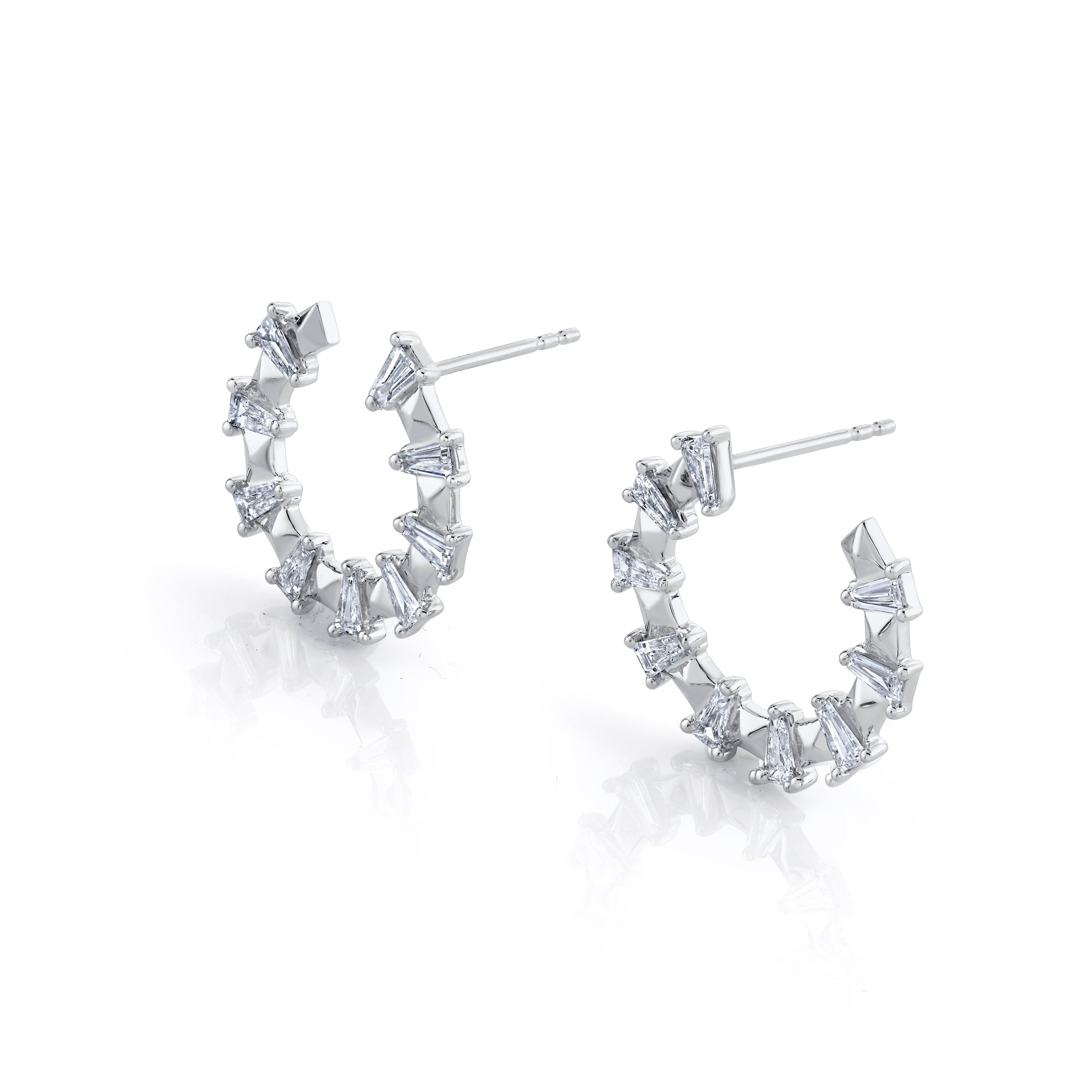Enhance your look with these sophisticated hoops featuring a unique blend of tapered baguettes and pyramids. Perfectly on-trend, these earrings will add a touch of