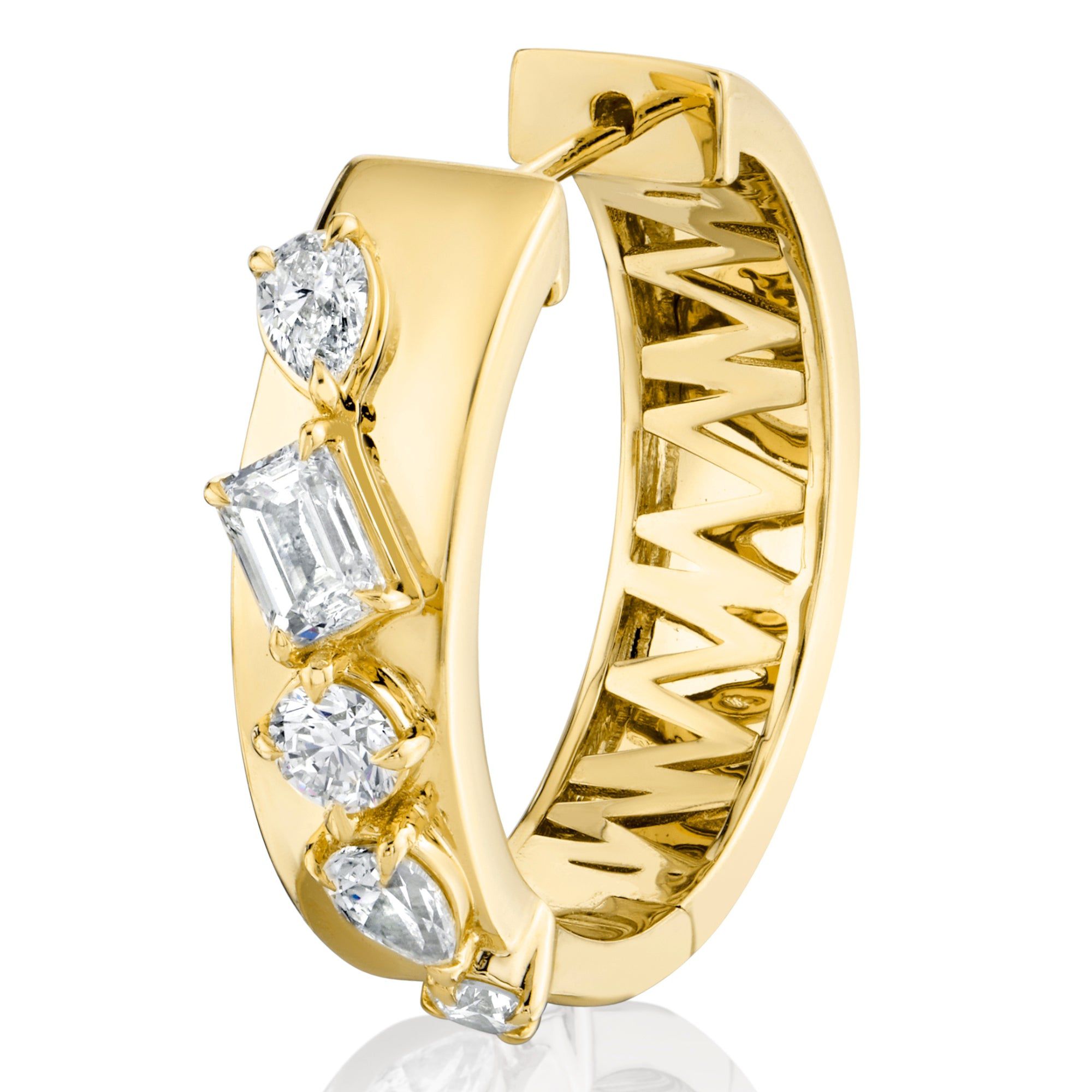 Montage Diamond Cross Hoops feature a stunning mix of cut diamonds, including pear-shaped, round, and emerald, aligned along the front of the gold hoops. The