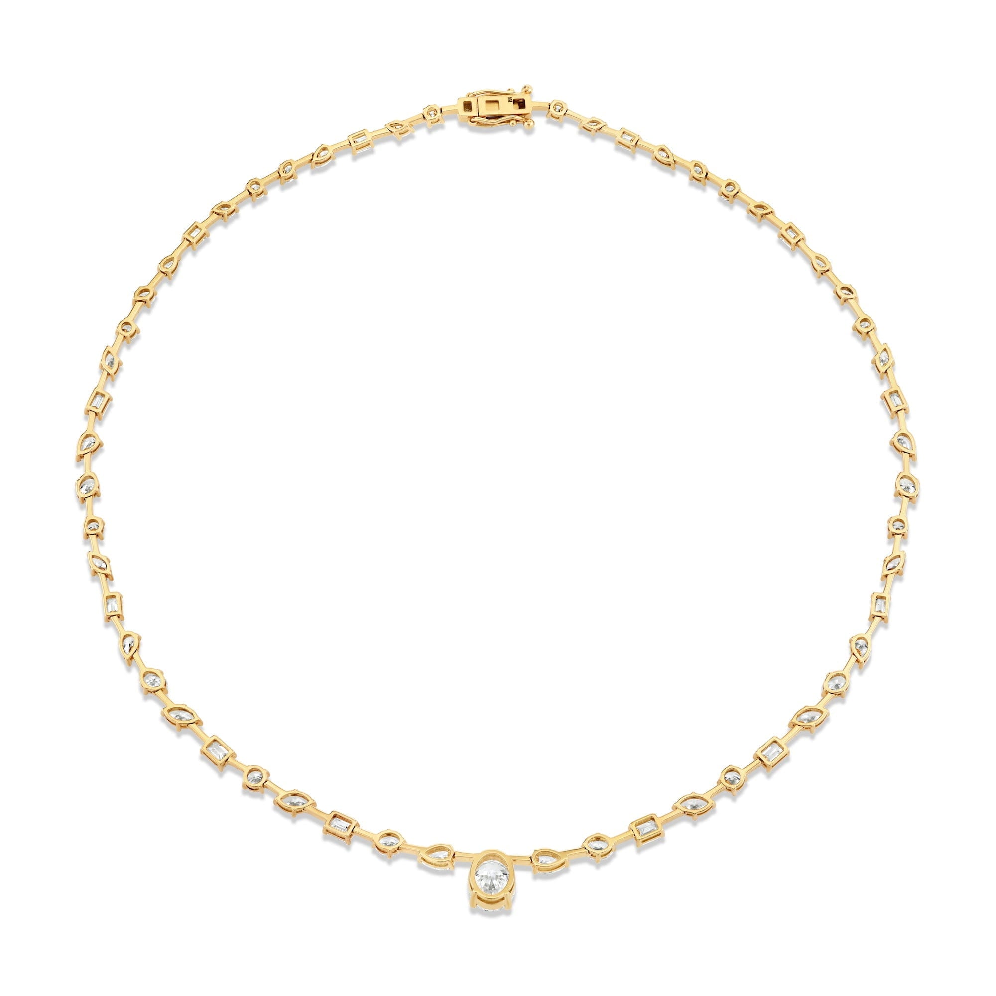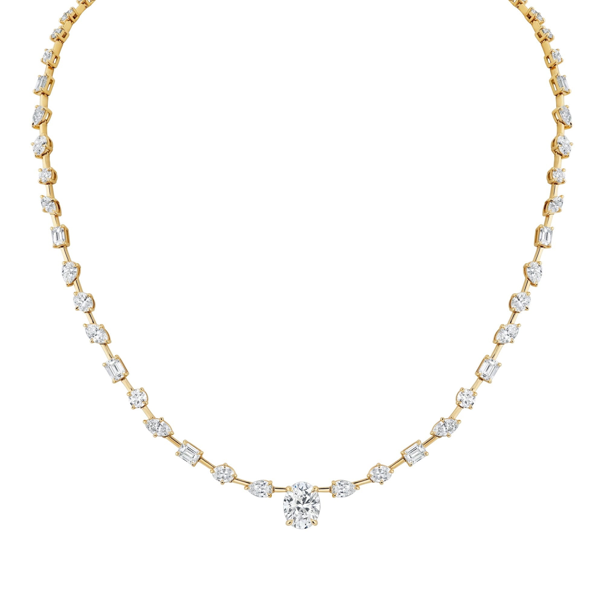 The Montage Oval Diamond Center Riviera Necklace showcases expert craftsmanship with a stunning oval diamond centerpiece, elegantly set within a classic diamond tennis necklace design.