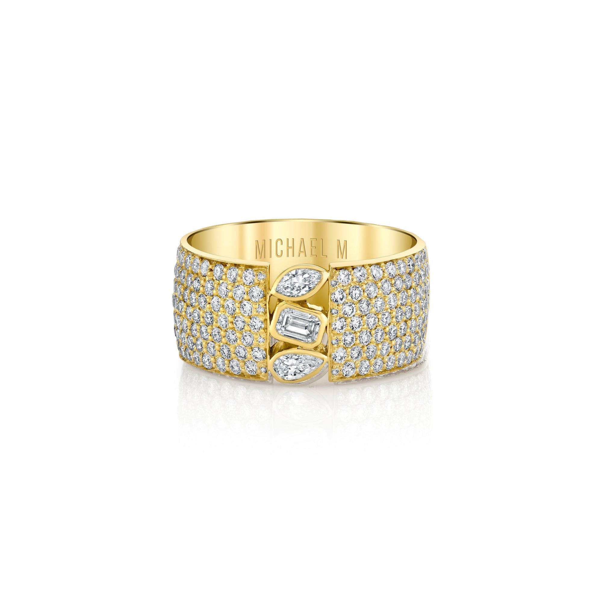 Expertly crafted, the Montage Pave Cigar Band boasts a stunning design, featuring 3 mixed-cut diamonds at its center and a top pave band. Elevate your