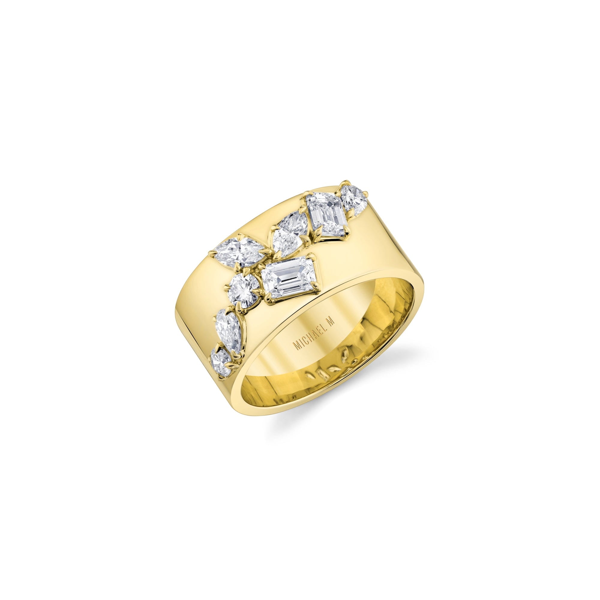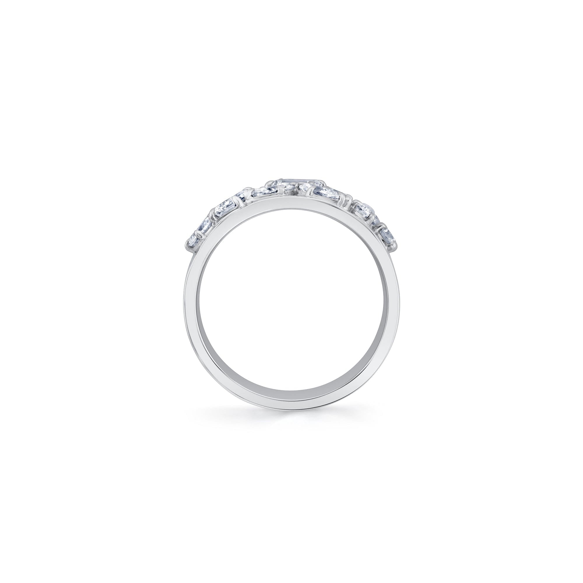 The Montage Wide Cluster Band is a stunning 10mm wide band that features an organic row of mixed cut diamonds, including emerald, marquise, and pear