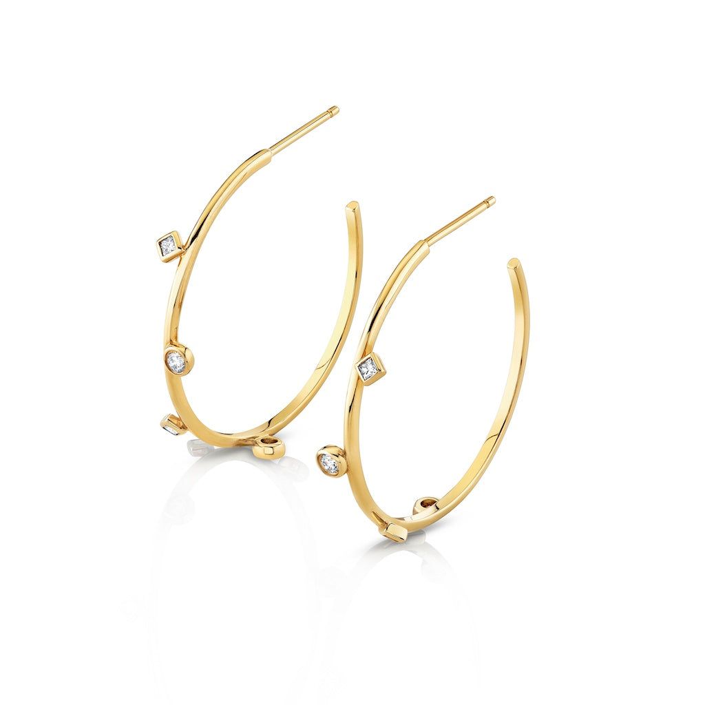 Thin hoop earrings adorned with alternating square and round-shaped bezel settings. The side settings give the appearance of a floating bezel setting which create a