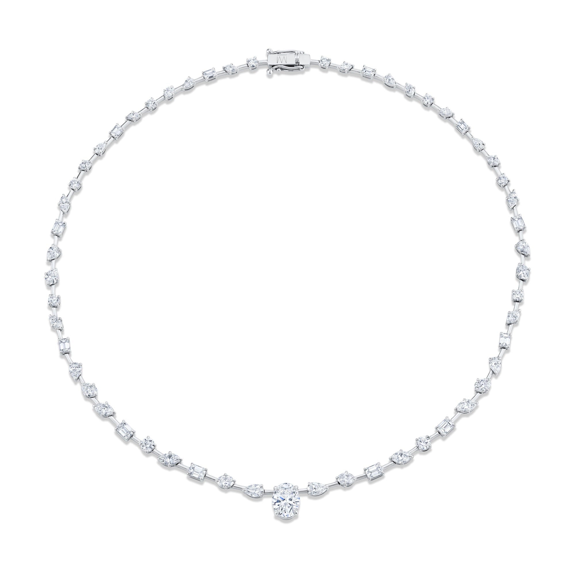 The Montage Oval Diamond Center Riviera Necklace showcases expert craftsmanship with a stunning oval diamond centerpiece, elegantly set within a classic diamond tennis necklace design.