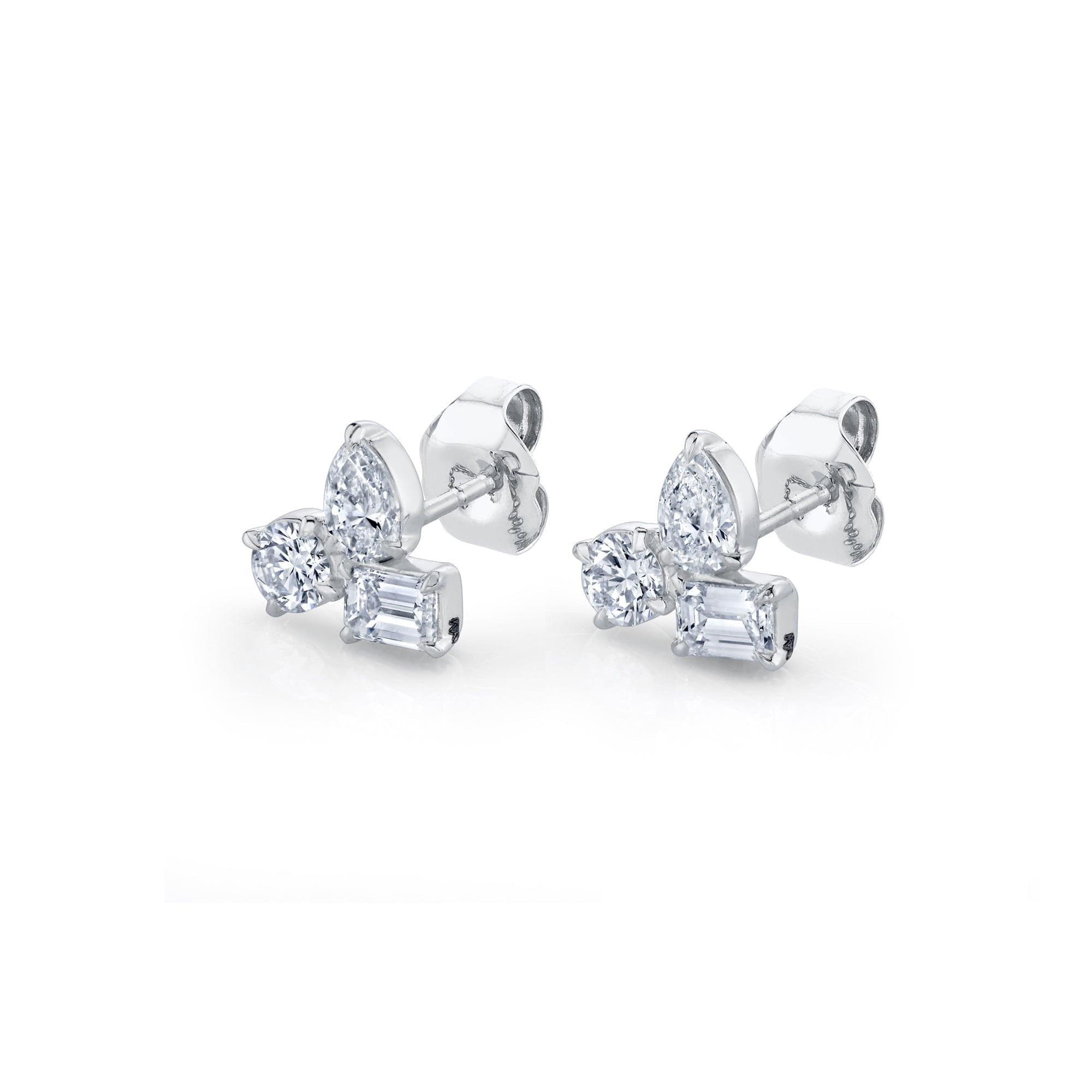 Montage 3 Cluster Stud Earrings showcase a sophisticated arrangement of  emerald, pear, and round cut diamonds, expertly clustered to maximize brilliance and visual impact. Each