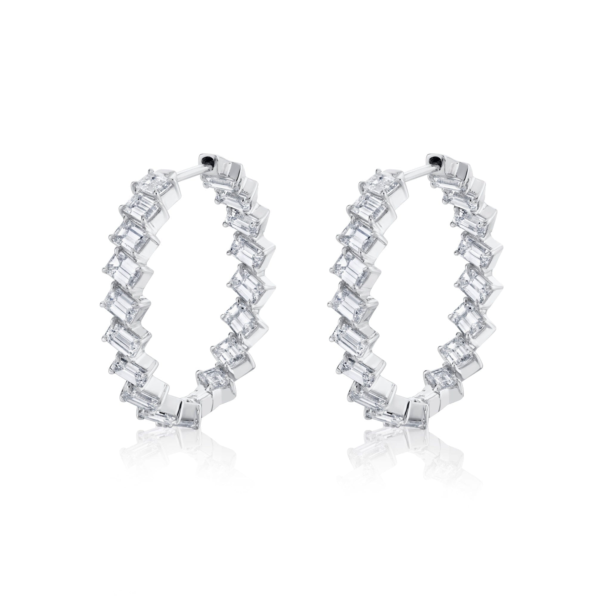 Experience elevated elegance with Montage emerald cut diamond eternity hoops. These beautifully crafted hoops showcase angled emerald cut diamonds on the front and interior for
