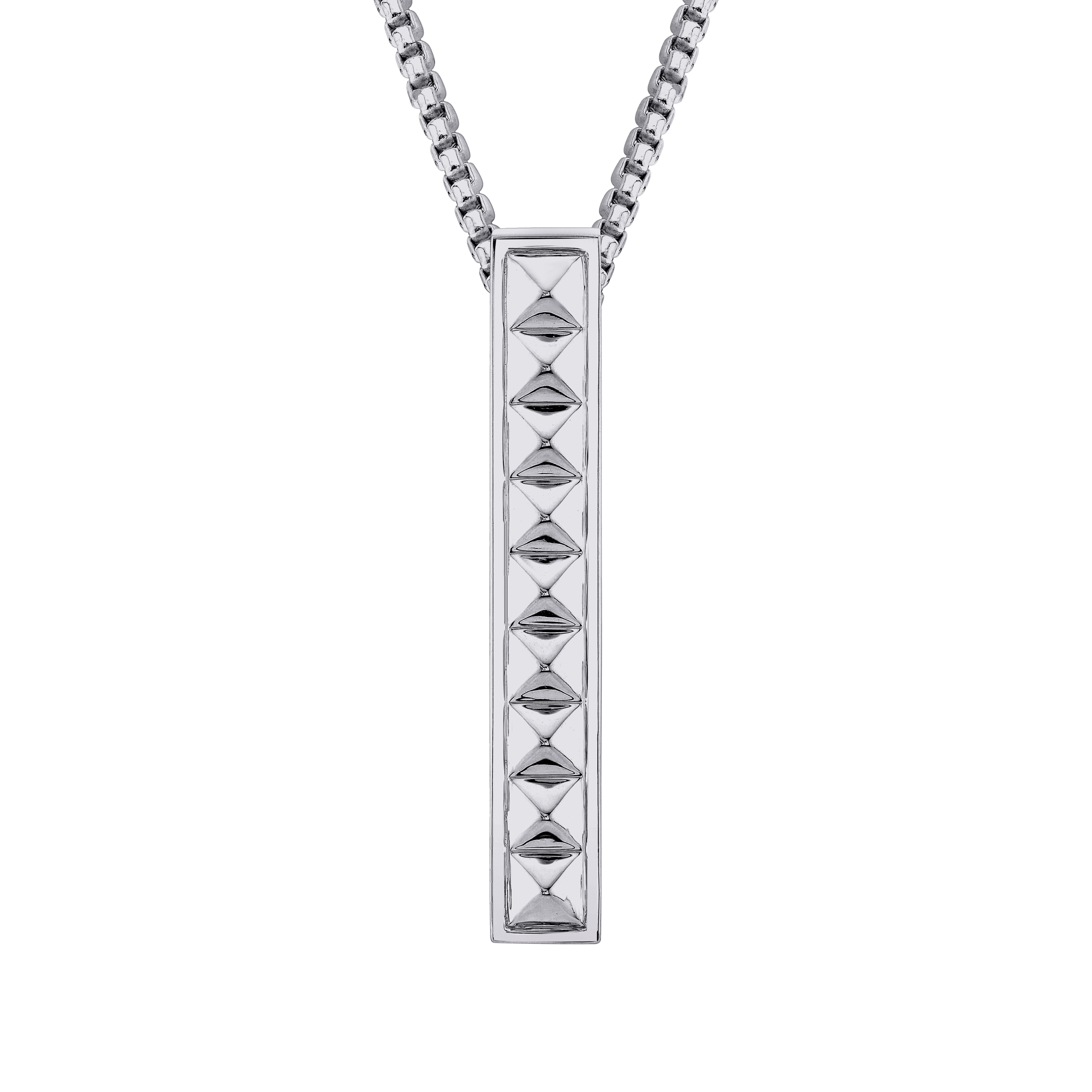 A minimalist row of pyramid studs is displayed on a structured pillar pendant necklace. The simplicity of the pillar pendant says less is more with