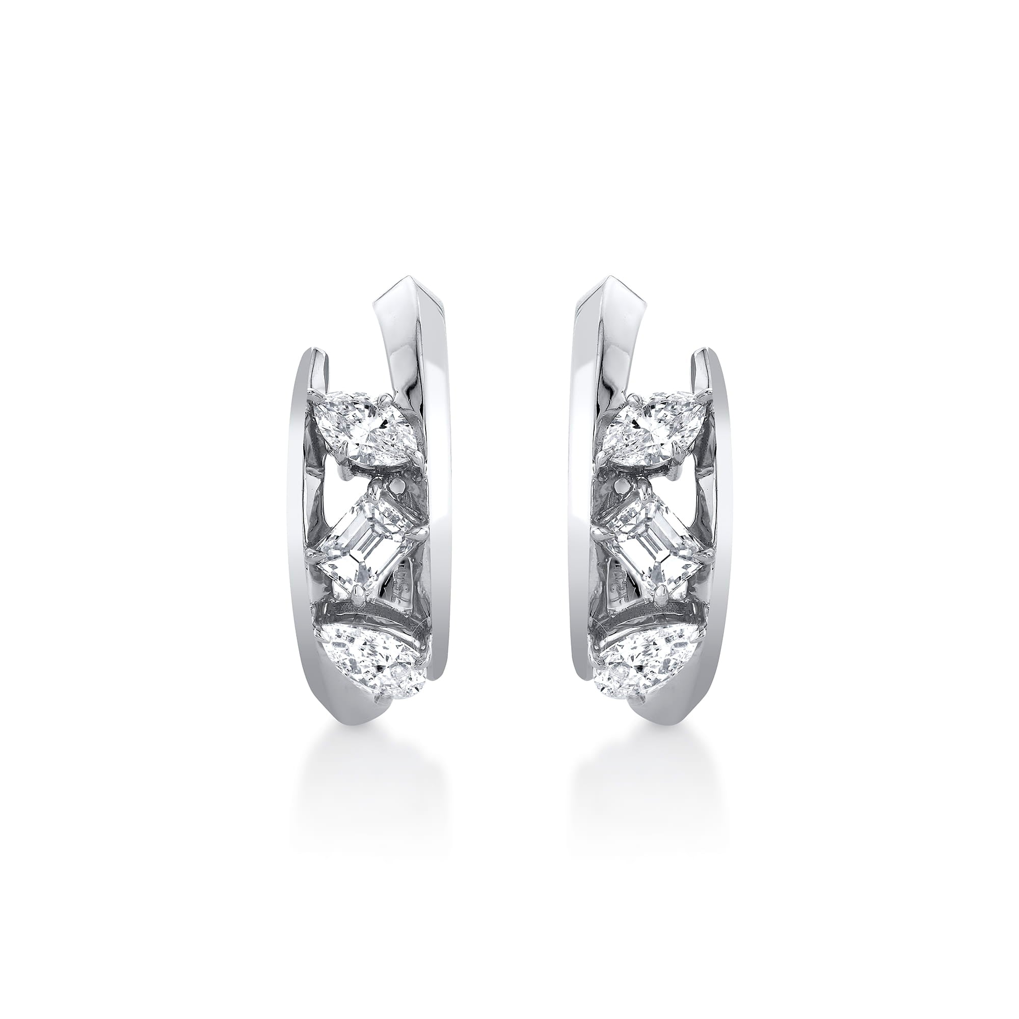 The Montage Bypass Hoops showcase an elegant knife-edge design with a stunning trio of diamond cuts, pear, emerald, and marquise, creating a sophisticated, multi-dimensional silhouette