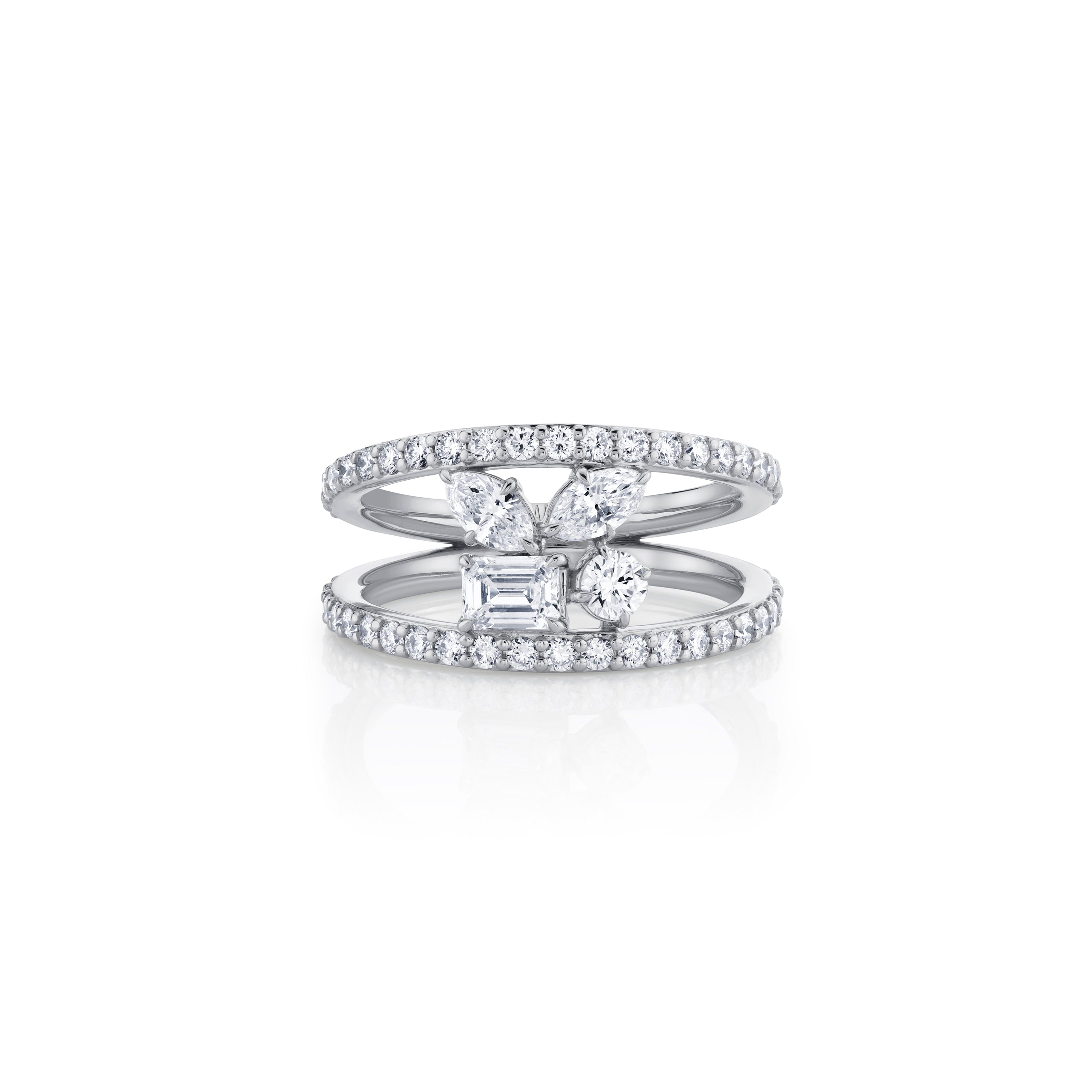 The Montage Single Cluster Tension Band features a captivating cluster of mixed cut diamonds suspended at its center, elegantly framed by two pavé bands that