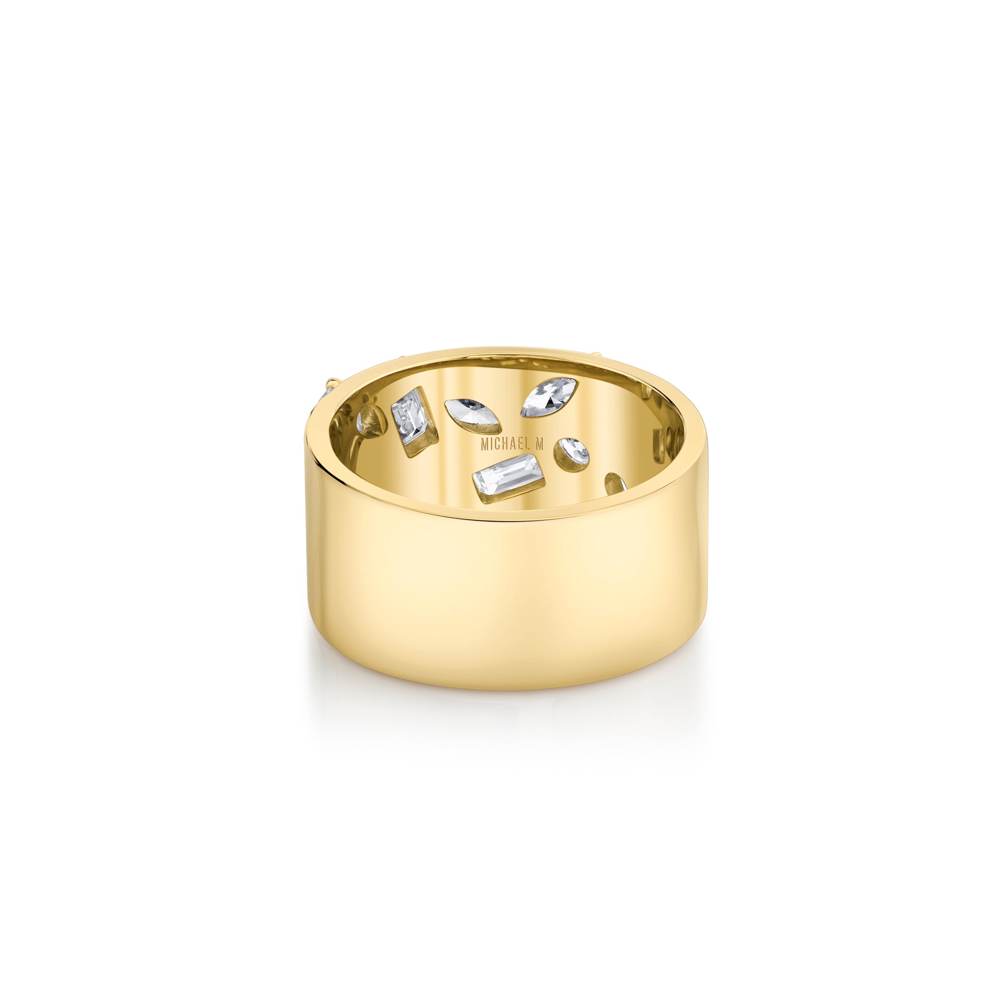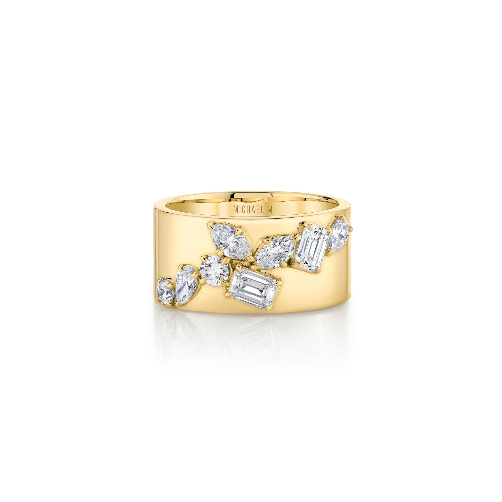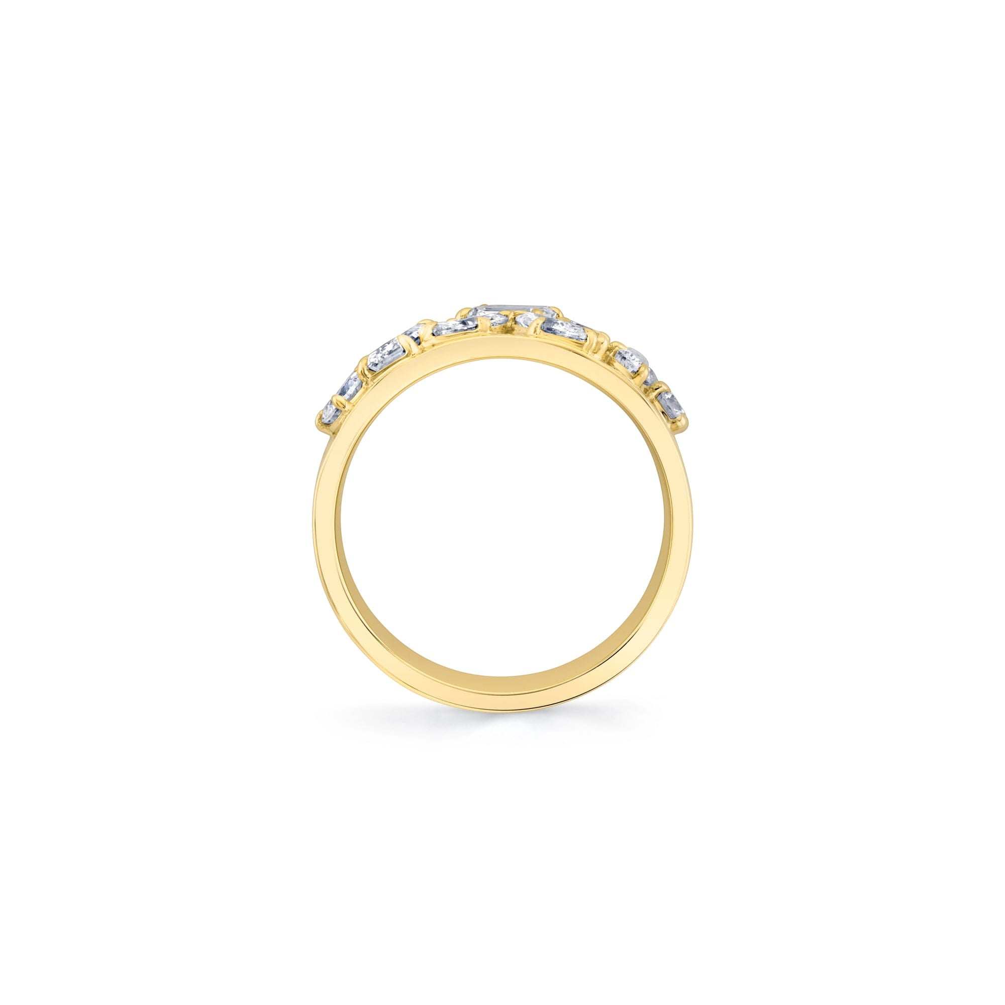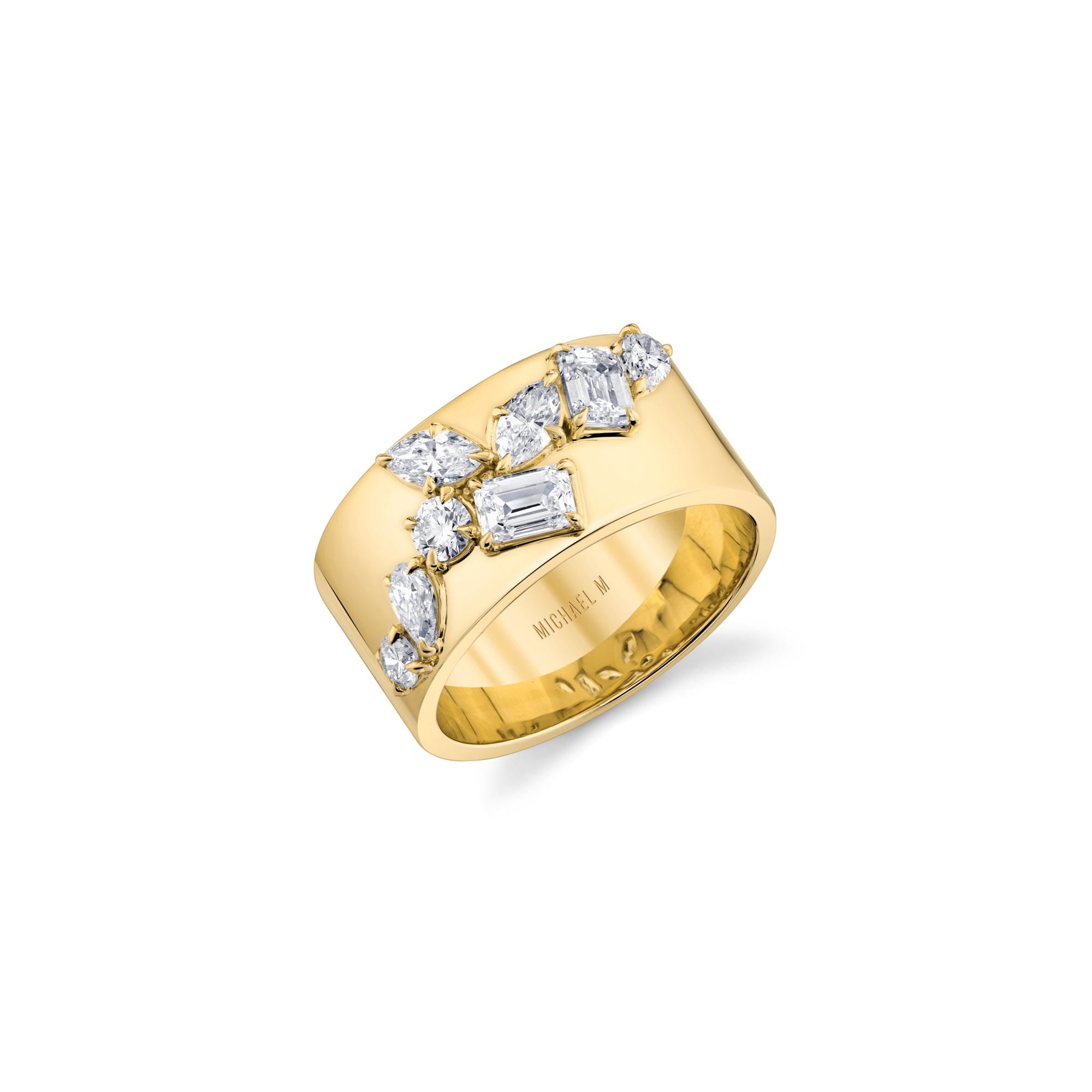 The Montage Wide Cluster Band is a stunning 10mm wide band that features an organic row of mixed cut diamonds, including emerald, marquise, and pear