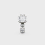 The Montage R824-3 features a striking emerald-cut center diamond, elegantly complemented by two baguette-cut diamonds on either side. The precise symmetry and clean lines of