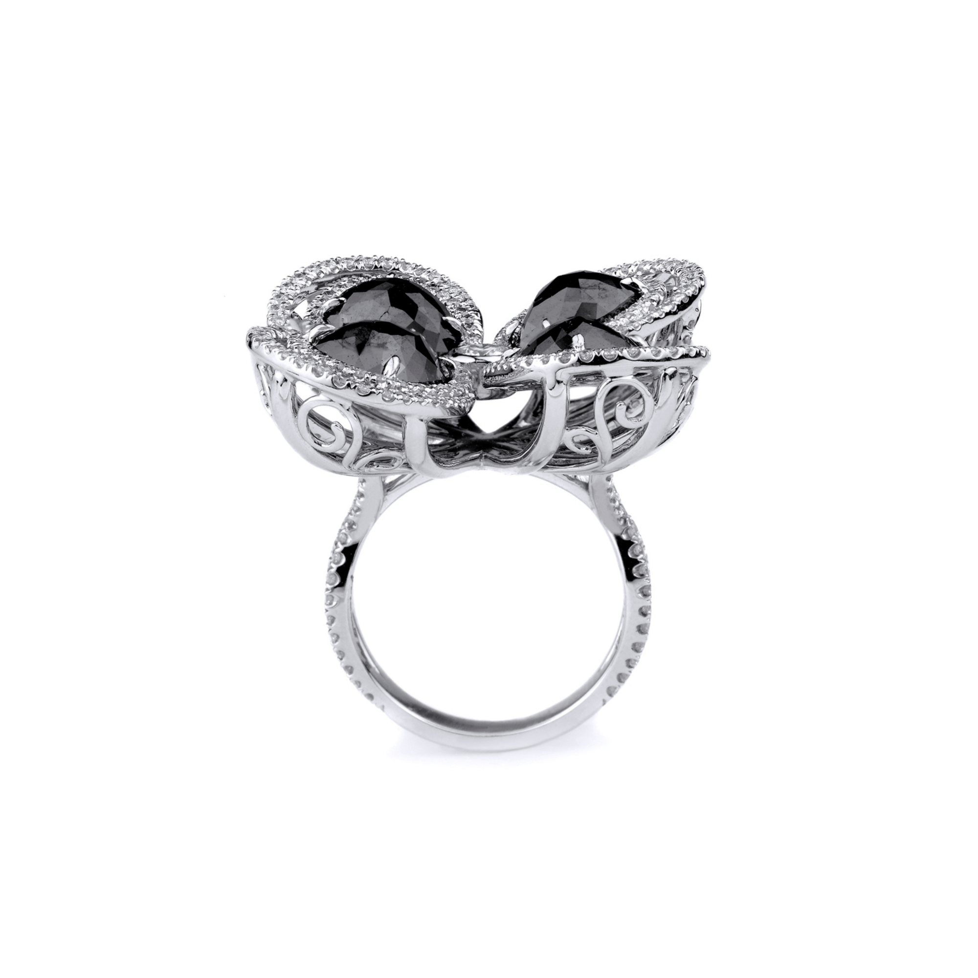 A bold and sophisticated statement piece, this exquisite ring showcases four pear-shaped black diamonds arranged in a captivating floral motif. A bezel-set center stone and