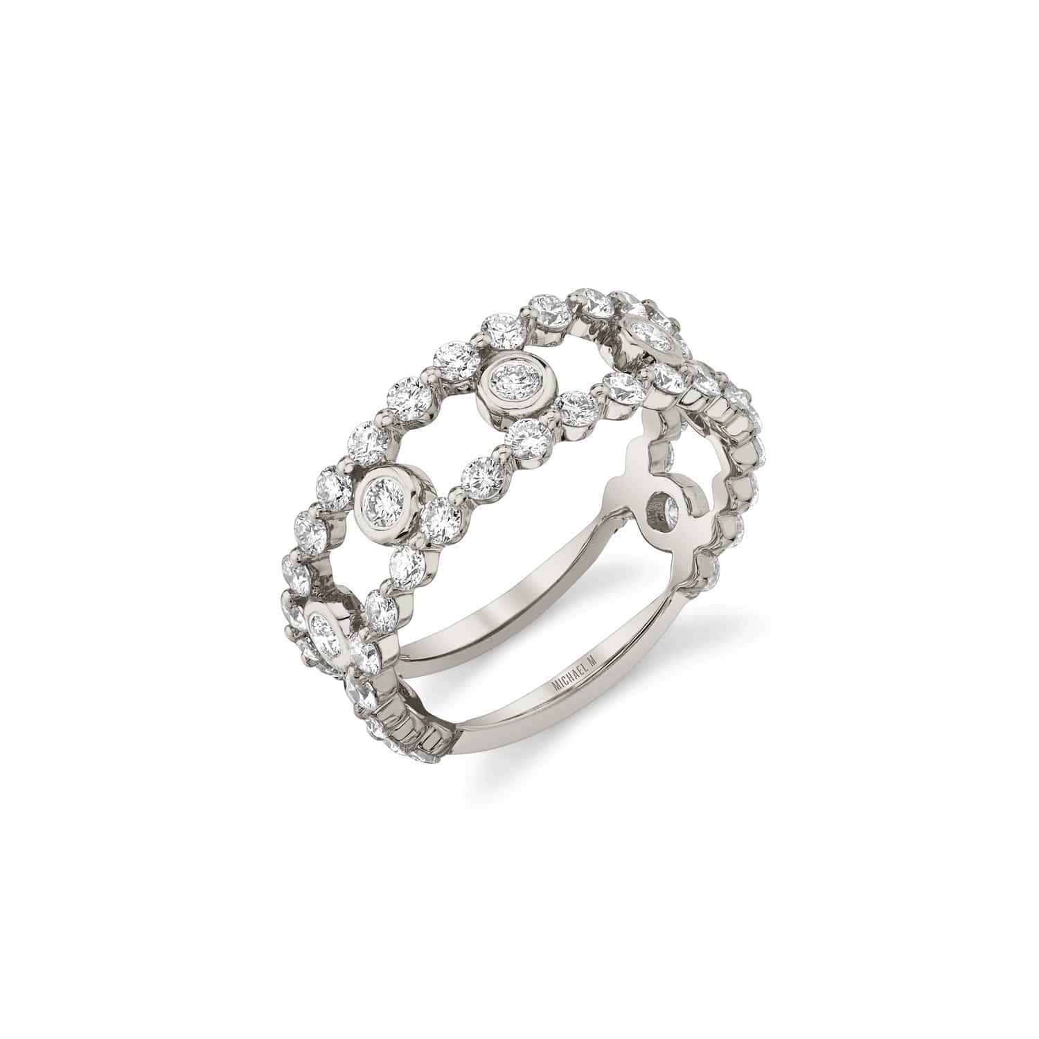 Refined symmetry that will elevate your individuality. The Cloud Stacked Ring features bezel-set diamonds balanced in negative space between two rows of prong-set diamonds. Stuns