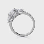 The R758-2 ring is in our Trinity collection. This particular ring boasts a 2 carat centerpiece and two large diamonds on either side, accompanied by