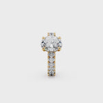 The Meksian R903-3 engagement ring masterfully blends traditional elegance with contemporary design, showcasing a radiant oval center diamond secured in a four-prong setting. Features matching