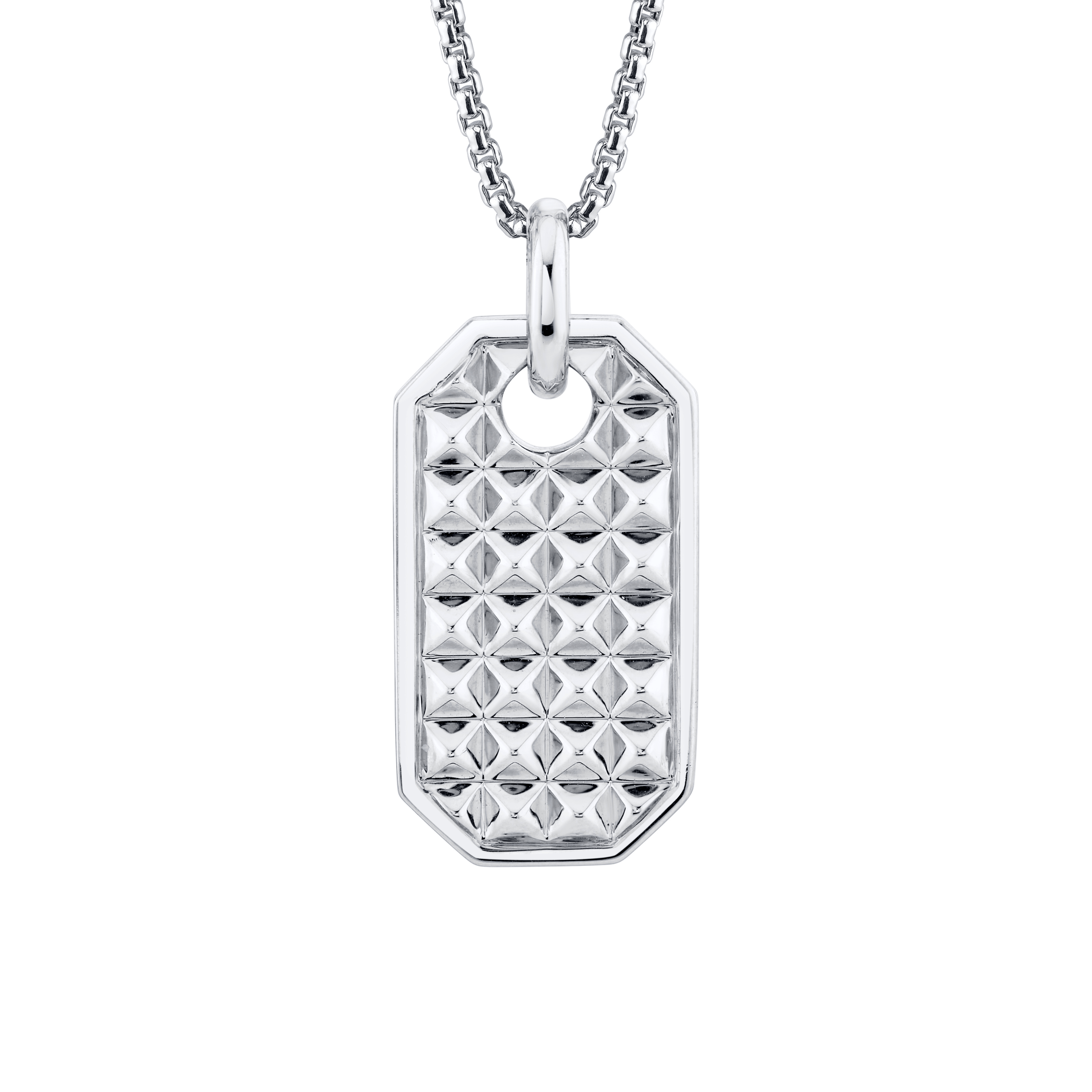 The pyramid textured motif creates a masculine look for the sophisticated man. Strong and powerful this Men's Tetra dog tag pendant is the finishing touch