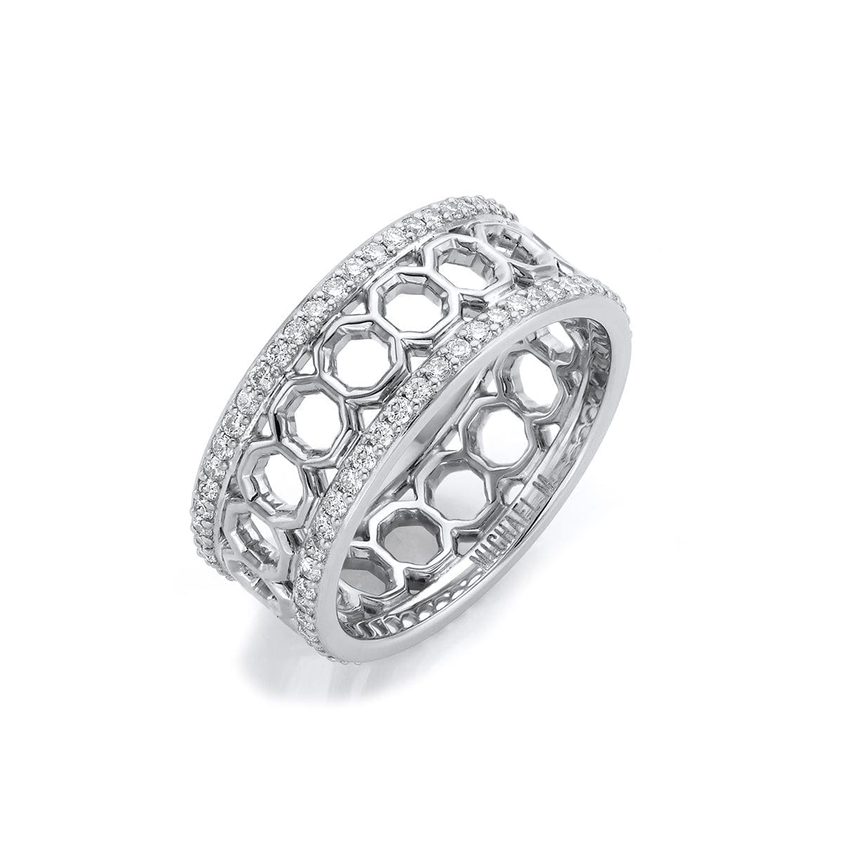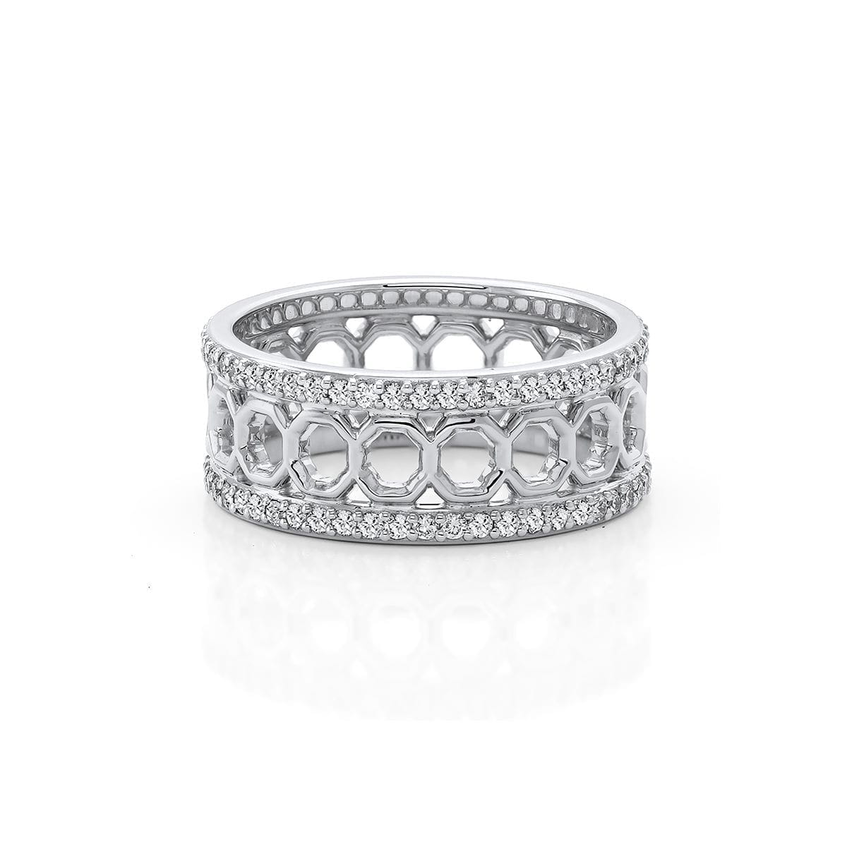 The OCTAVE wide band ring showcases a captivating motif of alternating yellow gold and white gold open octagon shapes, set between two pave bands. Strut
