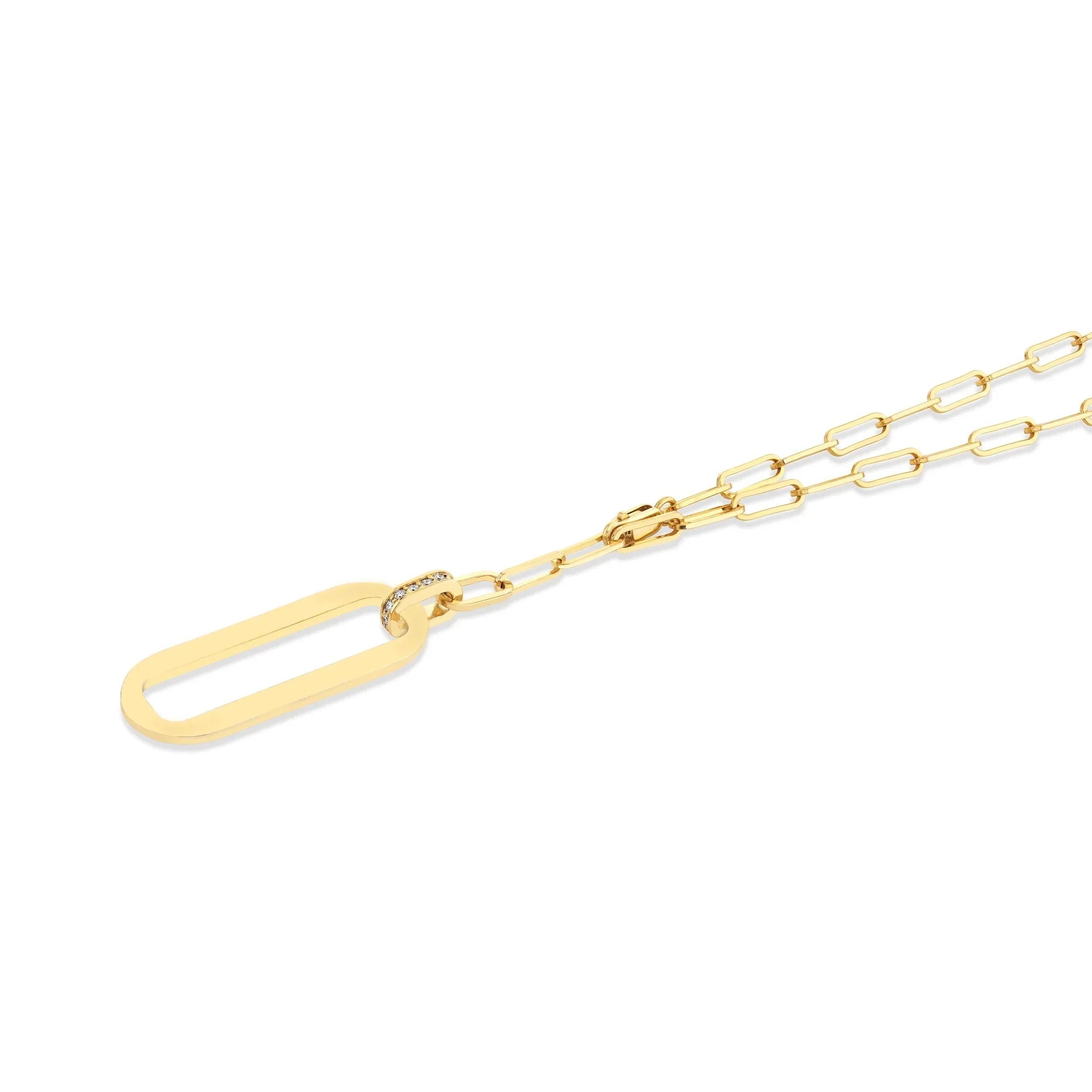 An elongated 14k gold linked pendant hangs heavy at the end of our signature paperclip chain. Clasp it anywhere along the chain for endless lariat