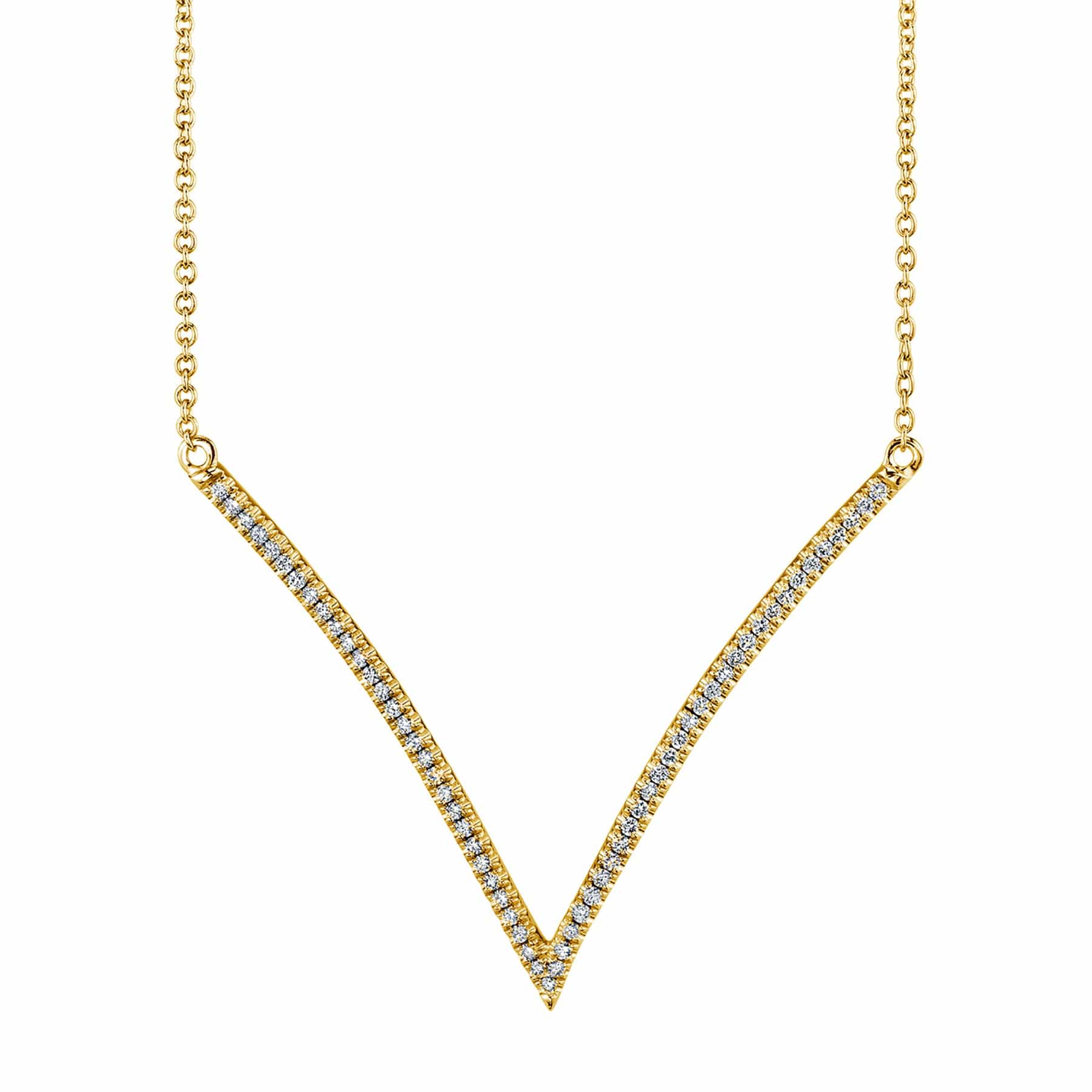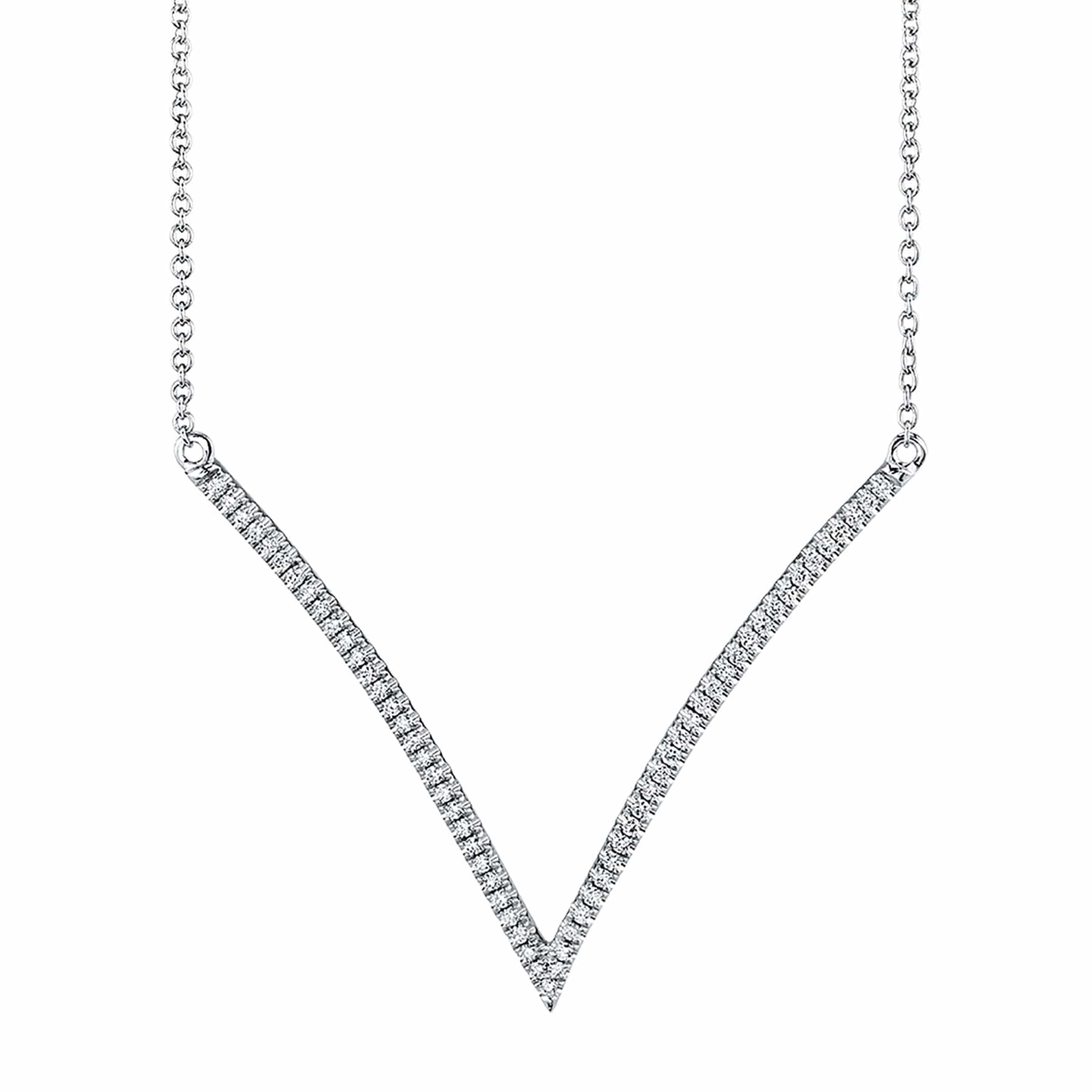 Our Wide V Diamond Pendant Necklace is perfect on its own or layered with our Single V Diamond Pendant (P218). Decorated with 0.27 carat round diamonds,